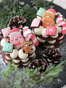 ブタちゃんとネコちゃんのサンタ🎅🐷🐱をテーマに、チーズフロスティングで仕上げるふんわり優しいケーキを作ります。